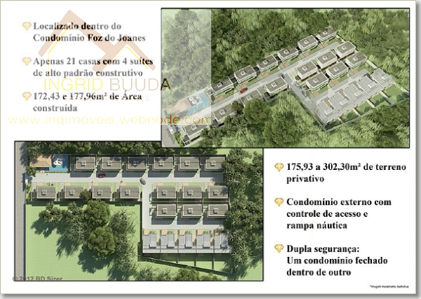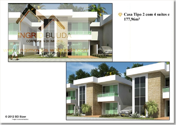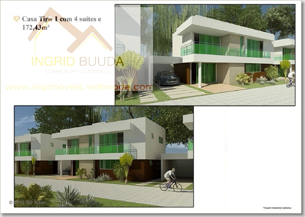 Casas de 4 quartos, 4 suites, garagem para 2 carros, 2 opções de planta, área total construída de 172,43 ou 177,96 m2.
